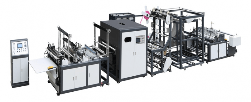 Máquina versátil e automática para produção de diferentes sacos e sacolas de TNT, o material pode ser laminado ou não. Conta com controlador de tensão, tela IHM touch screen, servo motores, foto célula, contador automático, triangulo dobrador, furador pneumático, disco para sanfonas laterais, sistema anti-estática e todo o sistema é por solda via ultrassom.